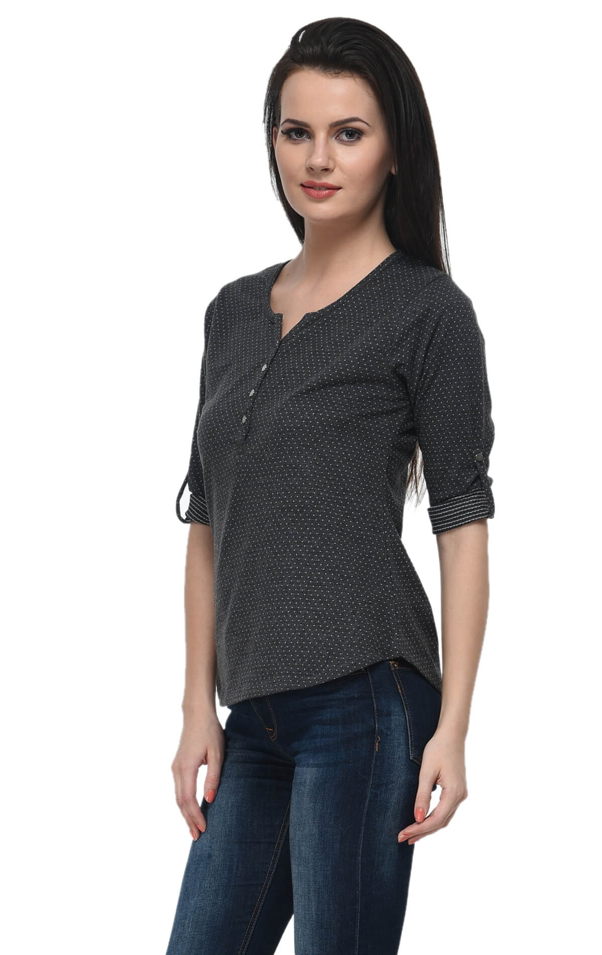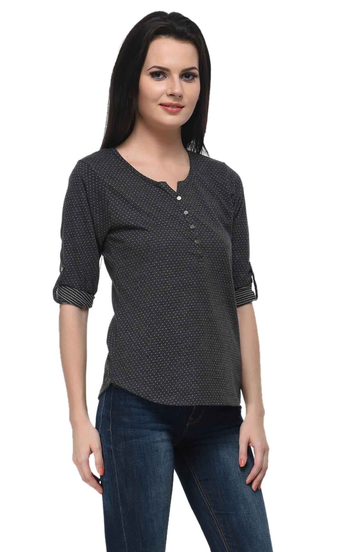 Upgrade your everyday wardrobe with this stylish black Henley neck top from FrenchTrendz. Designed for women who love comfort with effortless style, this top is crafted from a soft cotton-poly blend that offers breathability and durability for daily wear. The classic Henley neckline adds a modern touch, while the 3/4 sleeves provide a balanced look suitable for multiple seasons. The timeless black colour makes it easy to pair with jeans, trousers, skirts, or jeggings, creating a versatile outfit perfect for work, casual outings, or weekend wear.