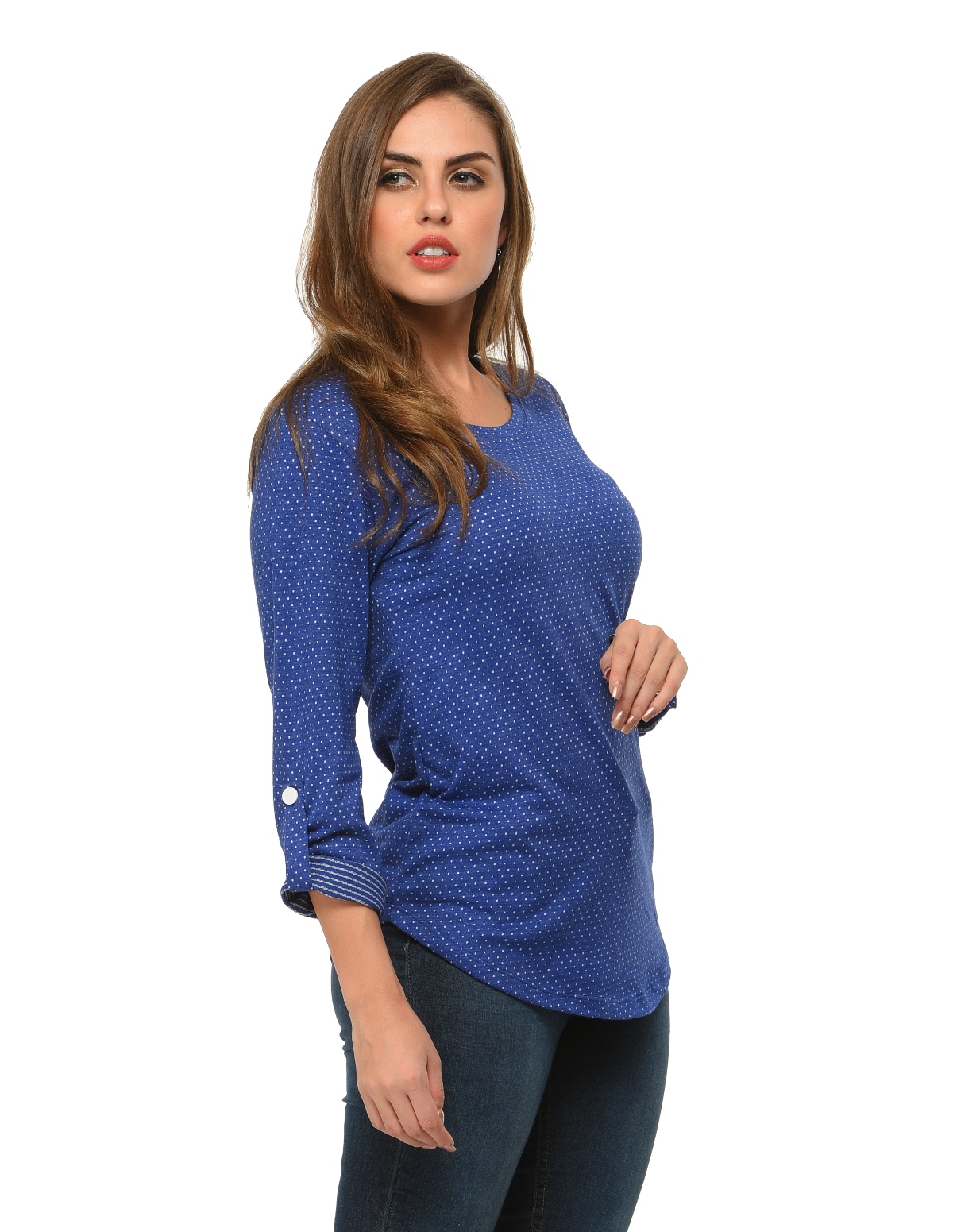 👚 Design Details: Round neck, full sleeves with roll-up tab, medium length