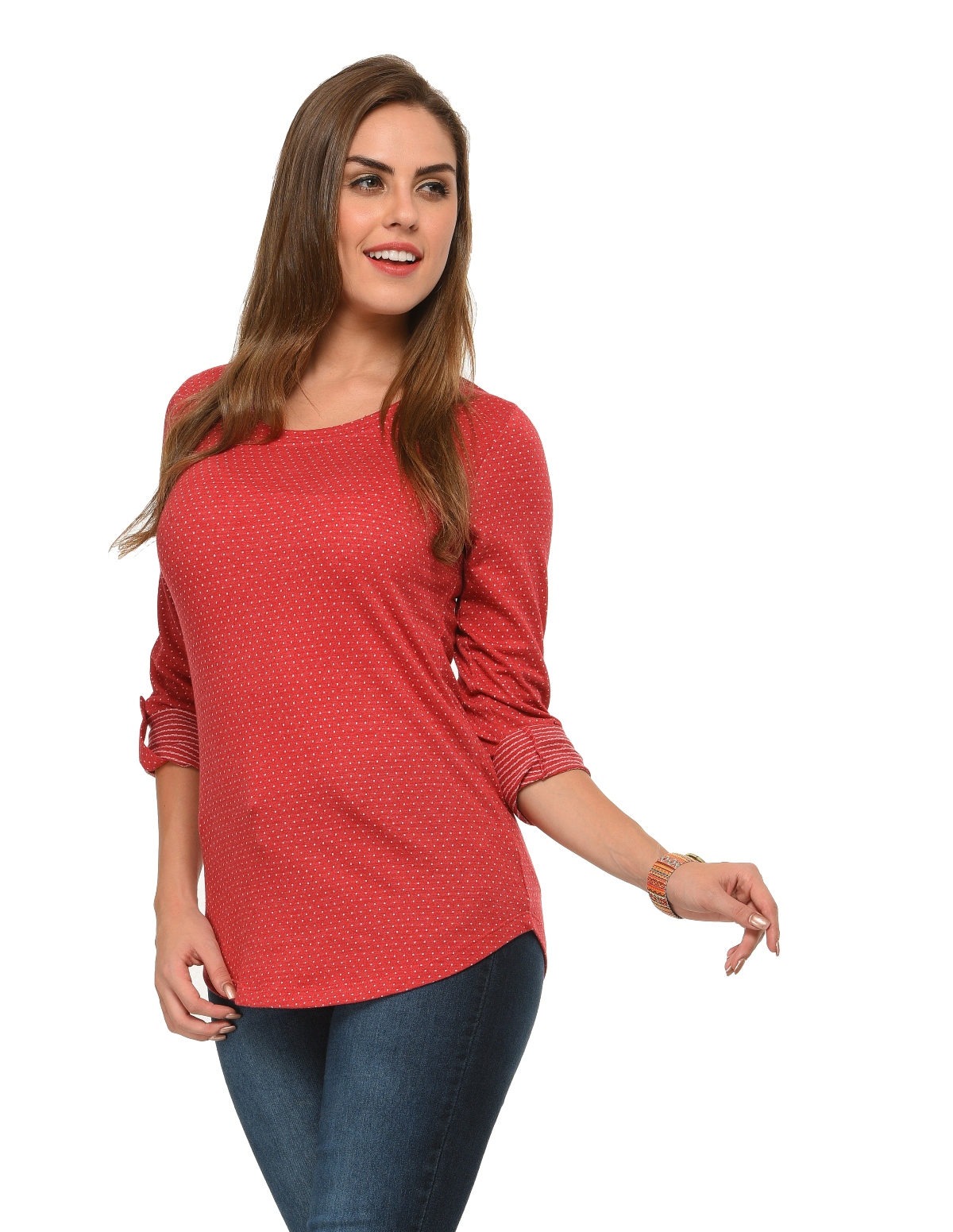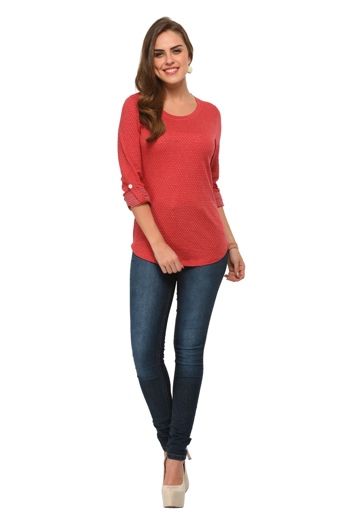 👚 Design Details: Round neck, full sleeves with roll-up tab, medium length