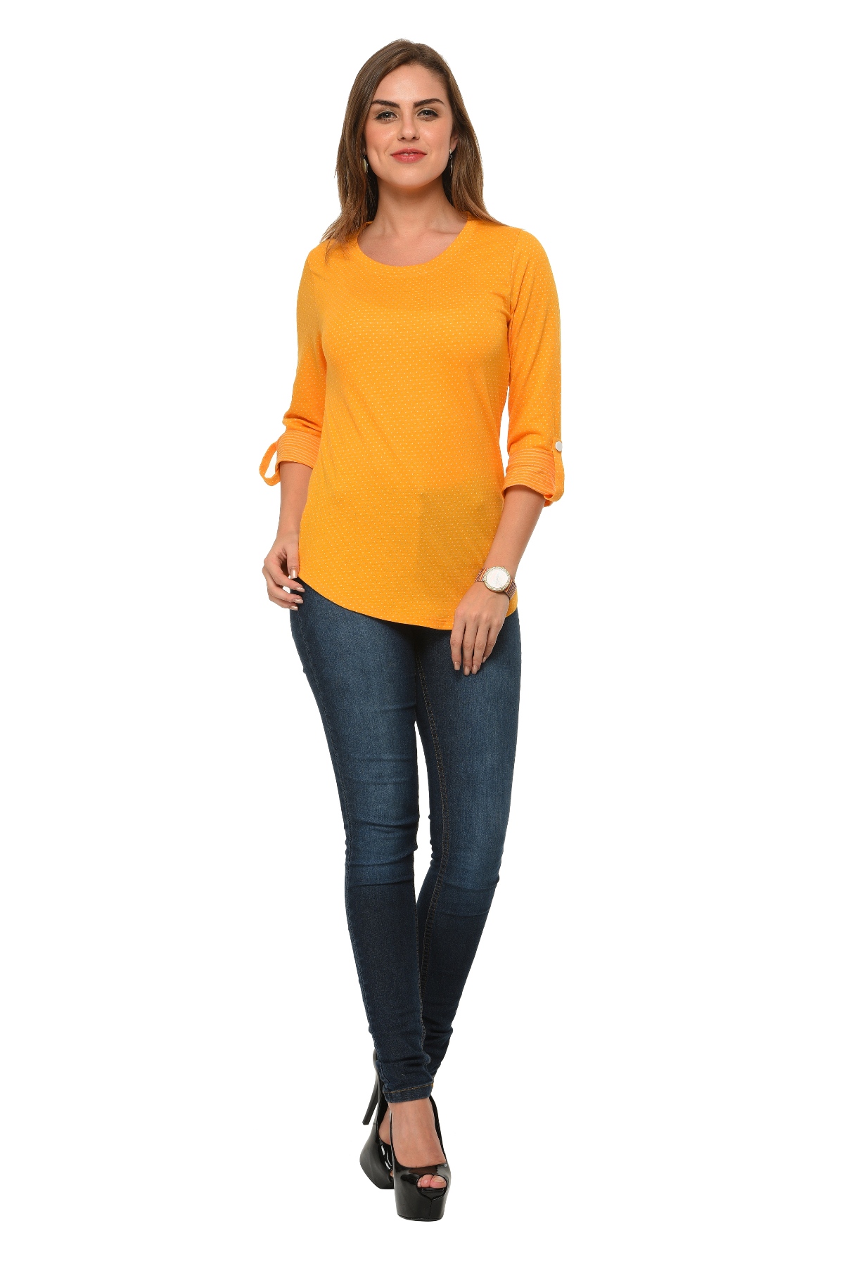 Frenchtrendz Cotton Poly Mustard Polka Dot Roll-Up Sleeve Tops