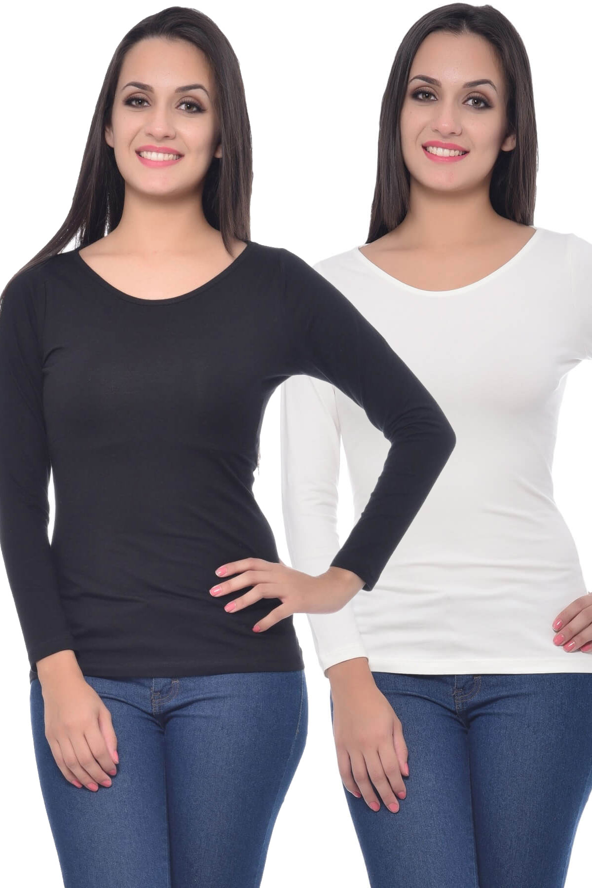 Upgrade your everyday wardrobe with the FrenchTrendz Cotton Spandex Black & Ivory Bateau Neck Full Sleeve Top Combo - a perfect blend of comfort, stretch, and timeless style.