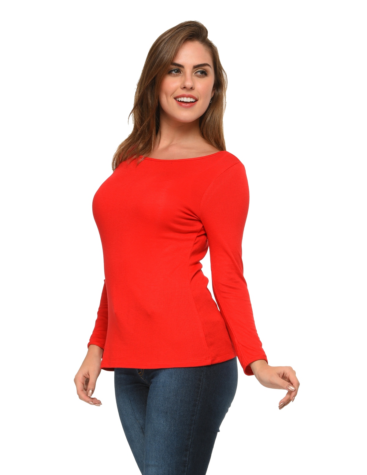 Frenchtrendz Bateau Neck Rib Viscose Red Full Sleeves Tops