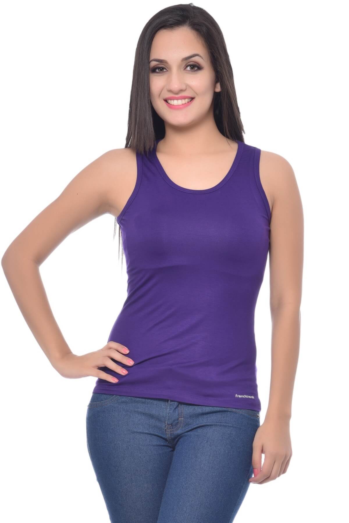 Stay stylish and comfortable in this medium-length purple tank top for women by Frenchtrendz, crafted from a soft, stretchy blend of 95% Viscose and 5% Spandex. Designed for all-day wear, it combines breathability with a flattering slim fit โ perfect for layering or wearing solo.