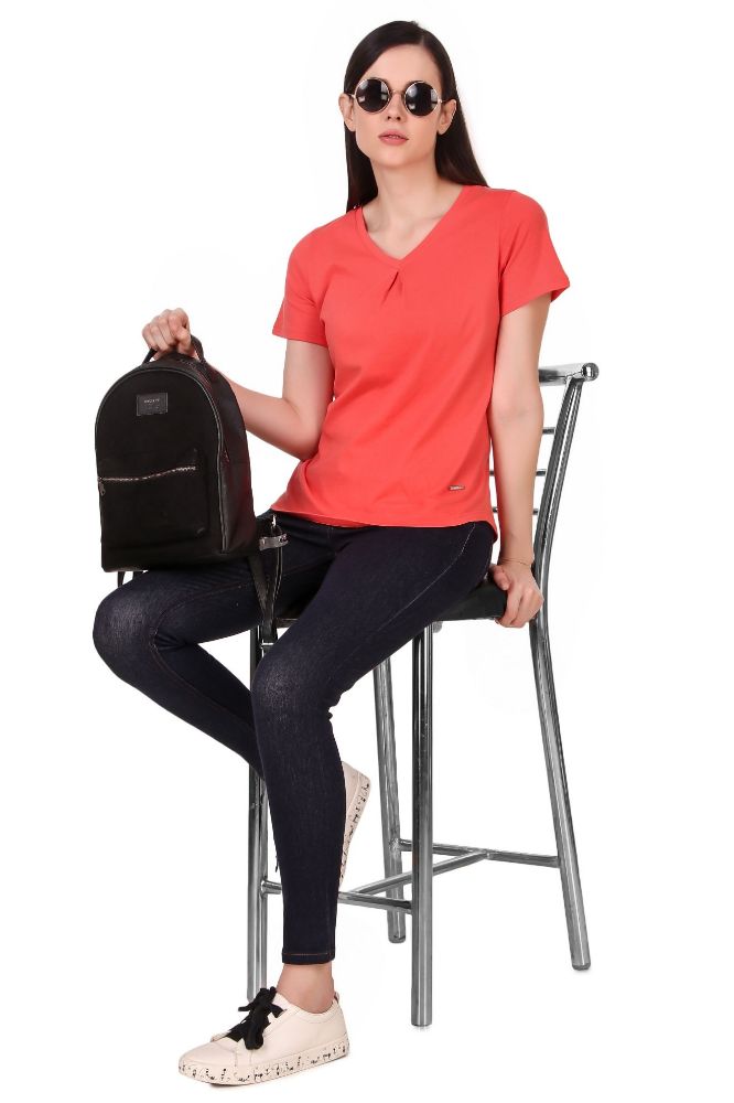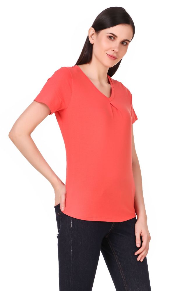 Frenchtrendz 100% Cotton Coral V-Neck Inverted Pleat Half Sleeve Medium Length Top