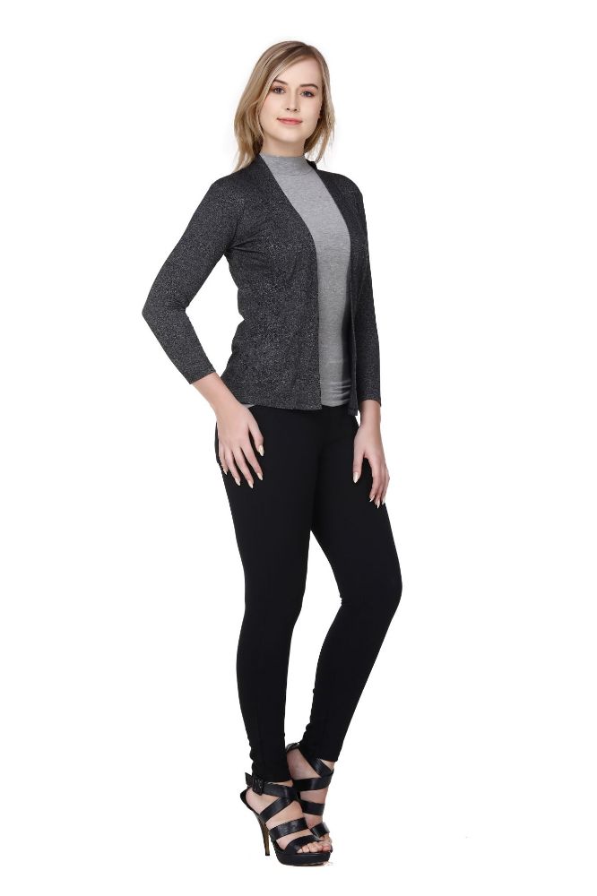 Enhance your everyday style with the Frenchtrendz Cotton Poly Jaspe Black Medium Length Shrug, designed to offer a perfect blend of comfort, style, and versatility. Made from a premium cotton-poly jaspe fabric, this shrug ensures maximum breathability and provides a gentle feel on the skin, making it ideal for all-day wear. The open front design adds a touch of elegance, making it easy to layer over tees, dresses, or casual wear. This versatile piece will effortlessly complement your wardrobe and personal style.