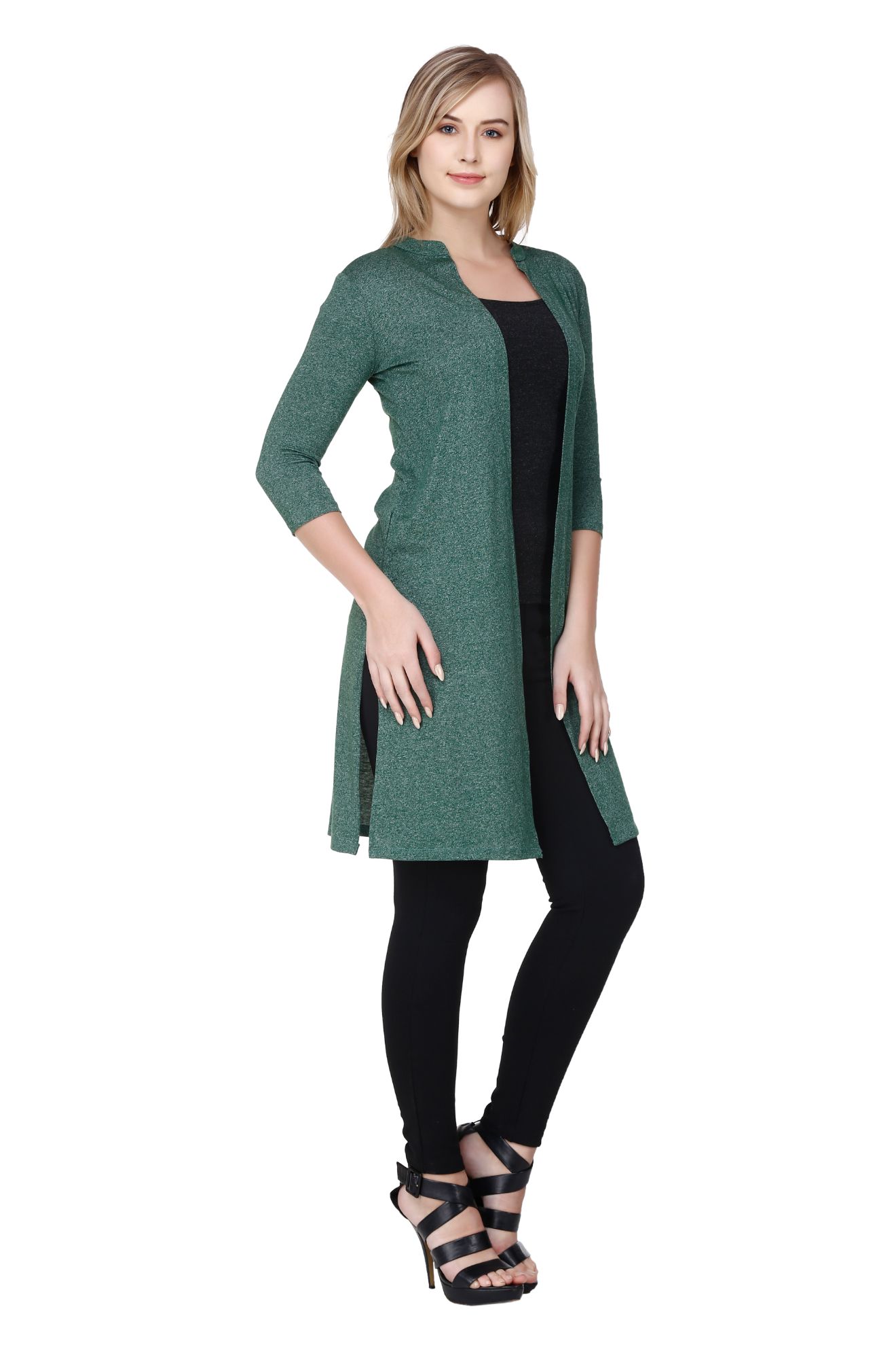 Enhance your everyday style with the Frenchtrendz Cotton Poly Jaspe Green Long Shrugs with Side Slit. Perfectly designed to complement your strappy tops, these long cotton shrugs features a stylish side slit and a long length for a trendy look. The ultra-soft Cotton Poly Jaspe fabric offers maximum comfort, making it suitable for all-season wear. Pair it with jeans, skirts, or casual dresses to create a chic and effortless appearance.