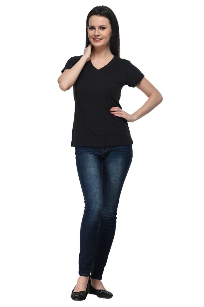 Frenchtrendz Cotton Slub Black V-Neck short Sleeve Medium Length Tees