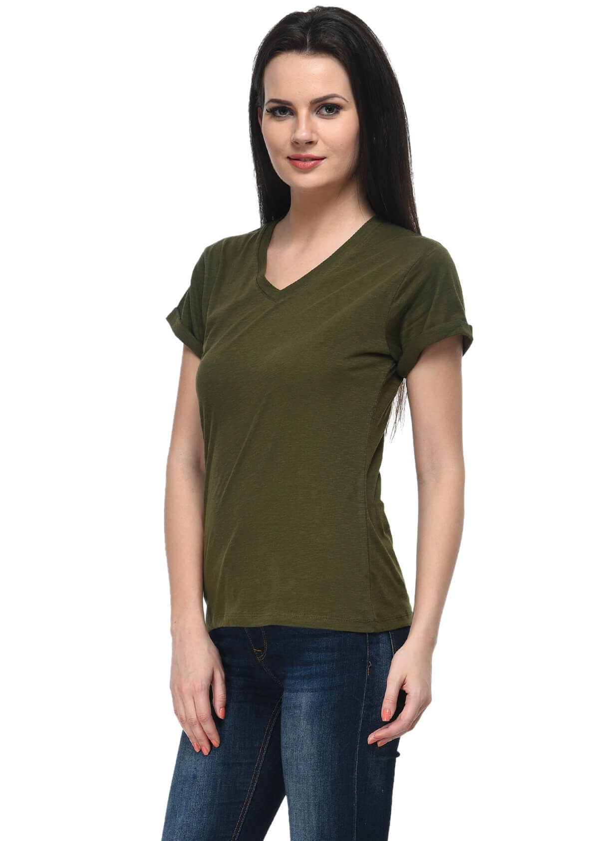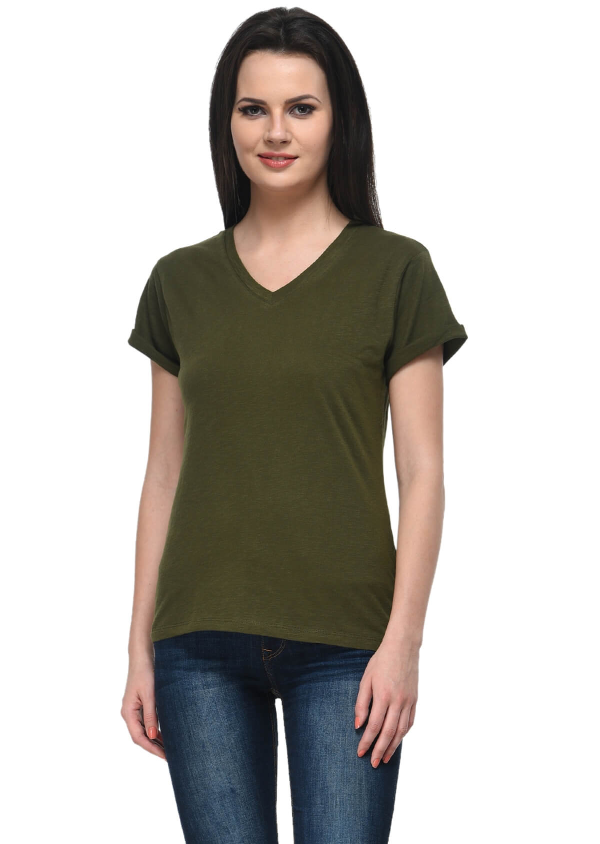 Frenchtrendz Cotton Slub Olive V-Neck short Sleeve Medium Length Tees