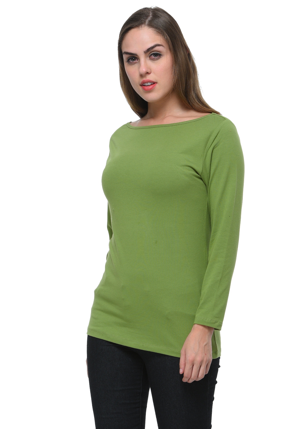 Frenchtrendz Cotton Spandex Parrot Green Boat Neck Full Sleeve Top