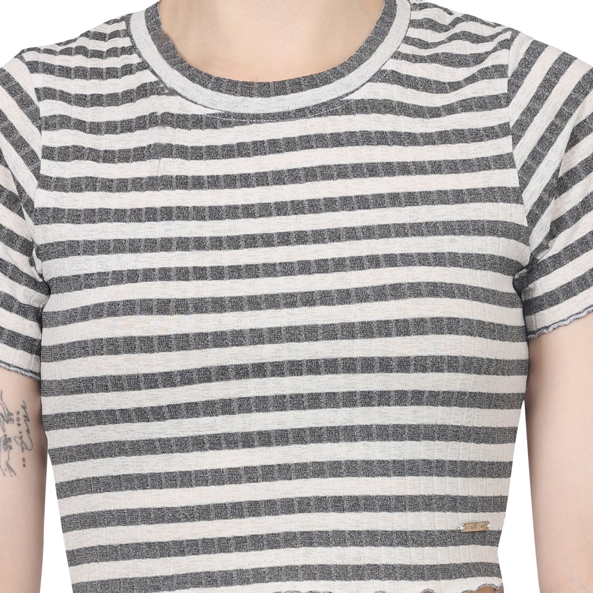 > Round neck, short sleeve, cropped length, striped crop tees top.