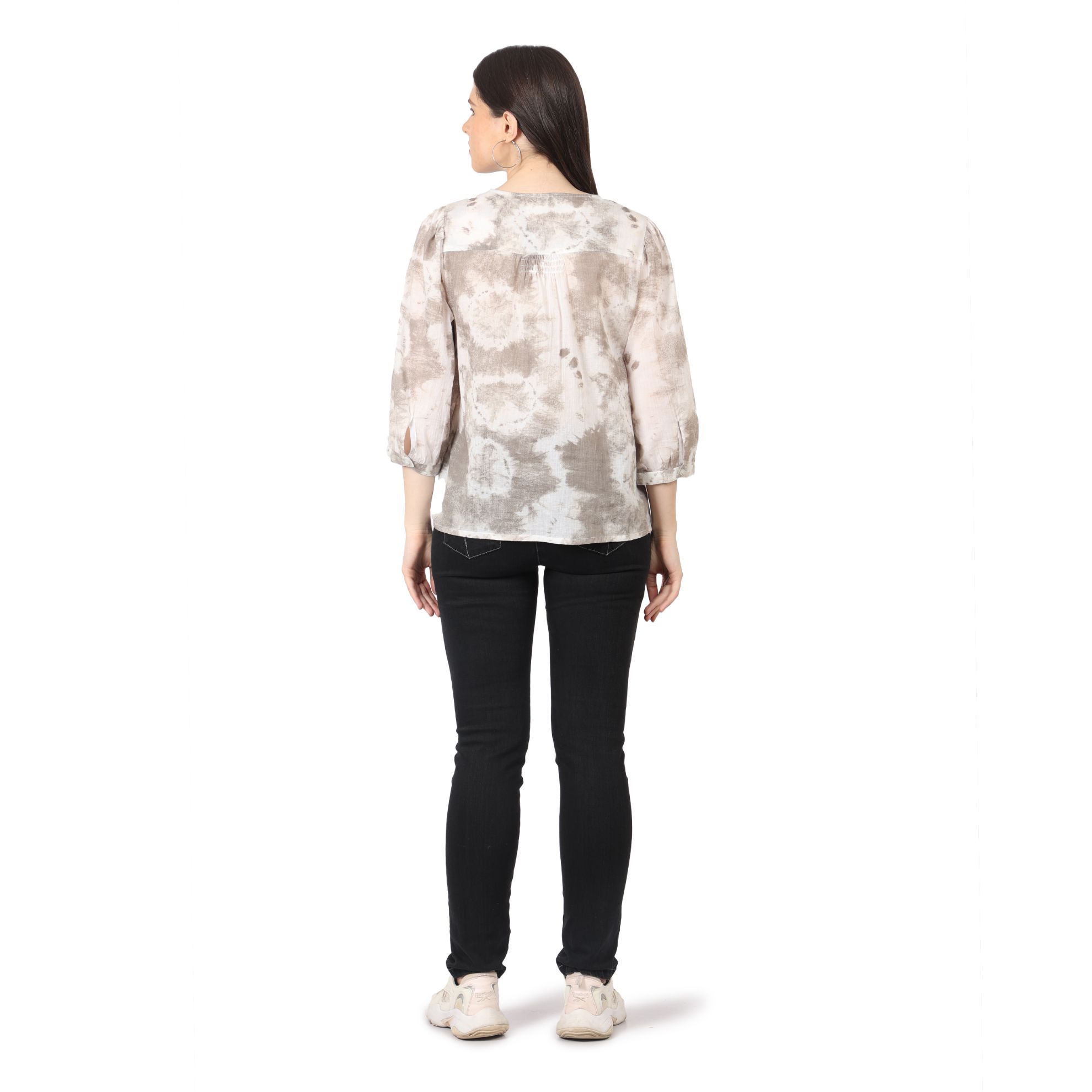 - FEATURES:casual 3/4 sleeve top, round neck down v neck with drawstring ,smoking effects on front yoke and back pannel, trendy summer top,loose fit tie & dye top, ,lightweight and super comfortable.